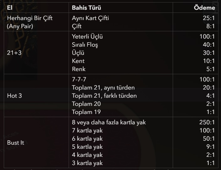 Hot 3: Bu bahis seçeneği, elinizdeki iki kart ile krupiyerin elindeki açık kartı kapsayan üç kartın kombinasyonuyla bahis yapmanıza olanak tanır.