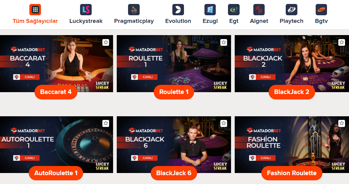 Matadorbet canlı casino alt yapısında Ezugi, Lucky Streak, Egt, pragmatic Play, Lagnet, Evoulution, Playtech ve Betgames markaları ile çalışır. Bu oyun markalarına ait Rulet, Bakara, Balackjack, Mega Wheel gibi oyunları sizlerin hizmetine sunan Matadorbet’te oyunlara Türkçe ve İngilizce dil seçenekleri ile oynamaya şansına sahipsiniz. Matadorbet’te oyunlarınızı oynarken sohbet penceresi sayesinde kurpiyerler ile sohbet edebilirsiniz.
